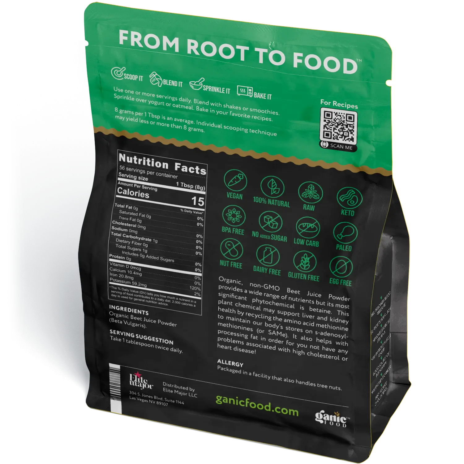 Serving Suggestion: 1 Tablespoon (8g) twice daily. One tablespoon of beet powder provides the nutrition of one beet. Use to add flavor, color, and nutrition to any recipe.